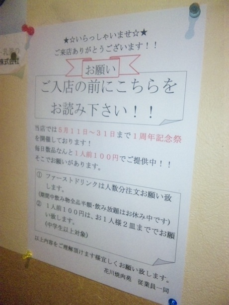 このブログでも以前に一度紹介させていただいた、ホルモン酒場 花川焼肉苑さんがオープン1周年を迎えるそうです
