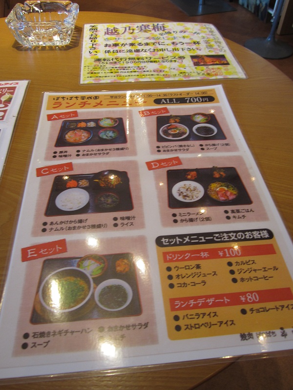 ランチにはポイントサービスがあって、ランチ1食ごとに捺印、6個でお食事券500円分、12個でお食事券1,000円分…と、最大24個までためるとお食事券3,000円分がもらえます。