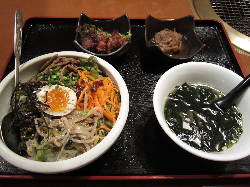 ご飯、野菜、卵、そしてお肉と海藻……栄養的にもバランスはいいかも